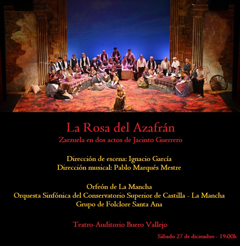 LA ROSA DEL AZAFRÁN27 DE FEBREROCIUDAD REAL LA ROSA DEL AZAFRÁN27 DE DICIEMBRE TEATRO BUERO VALLEJOGUADALAJARA NUEVA PRESIDENTA DEL ORFEÓN DE LA MANCHA:MARÍA ROSA CANDEL TÁRRAGA Repertorio para bodas... Facebook X-twitter Youtube Instagram